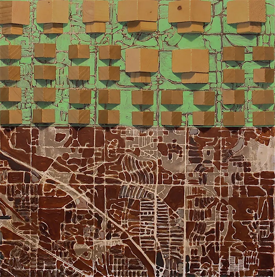 Traveling Through features mixed‑media and assemblage works by Twin Cities–based artist Jeannine Spooner Kitzhaber. Inspired by digital mapping systems and shifting landscapes, Kitzhaber translates GPS imagery and the geometry of urban/suburban grids into tactile compositions using found objects, painting, drawing, and screen‑printing. The work reflects on how technology reshapes our connection to place and captures the transformation of woodlands and prairies into expanding developments.